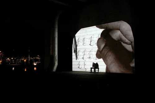 A woman receives a magical letter that takes her on a fantastical journey to find a man she has never met. B is a visual combination of live actors, video and live shadow projections.